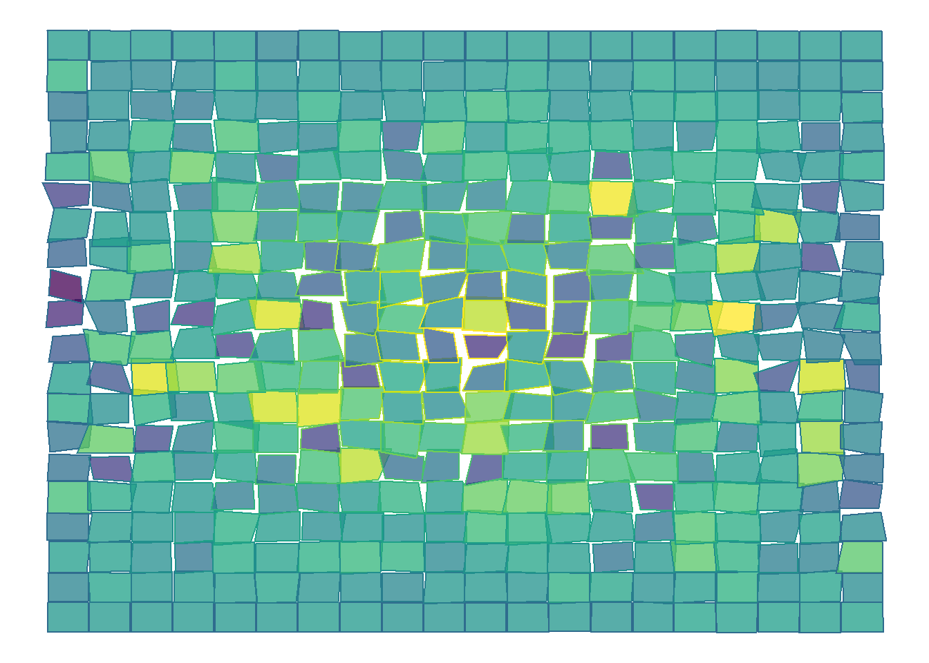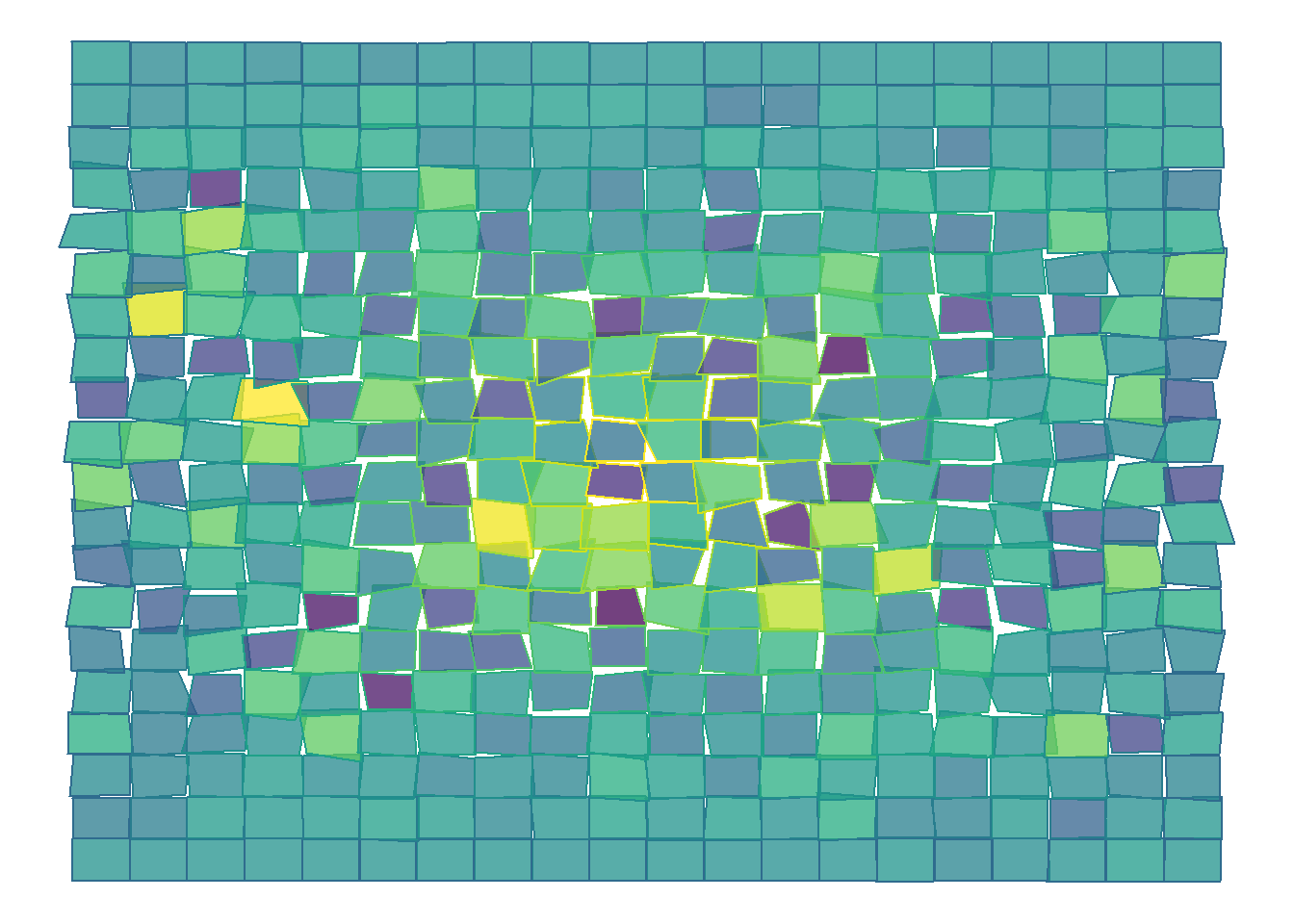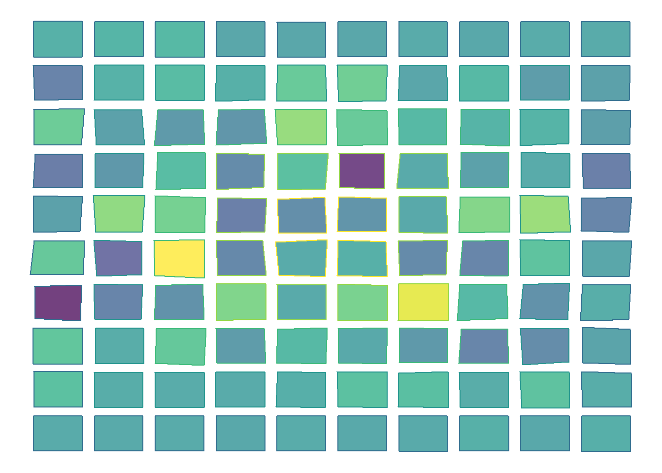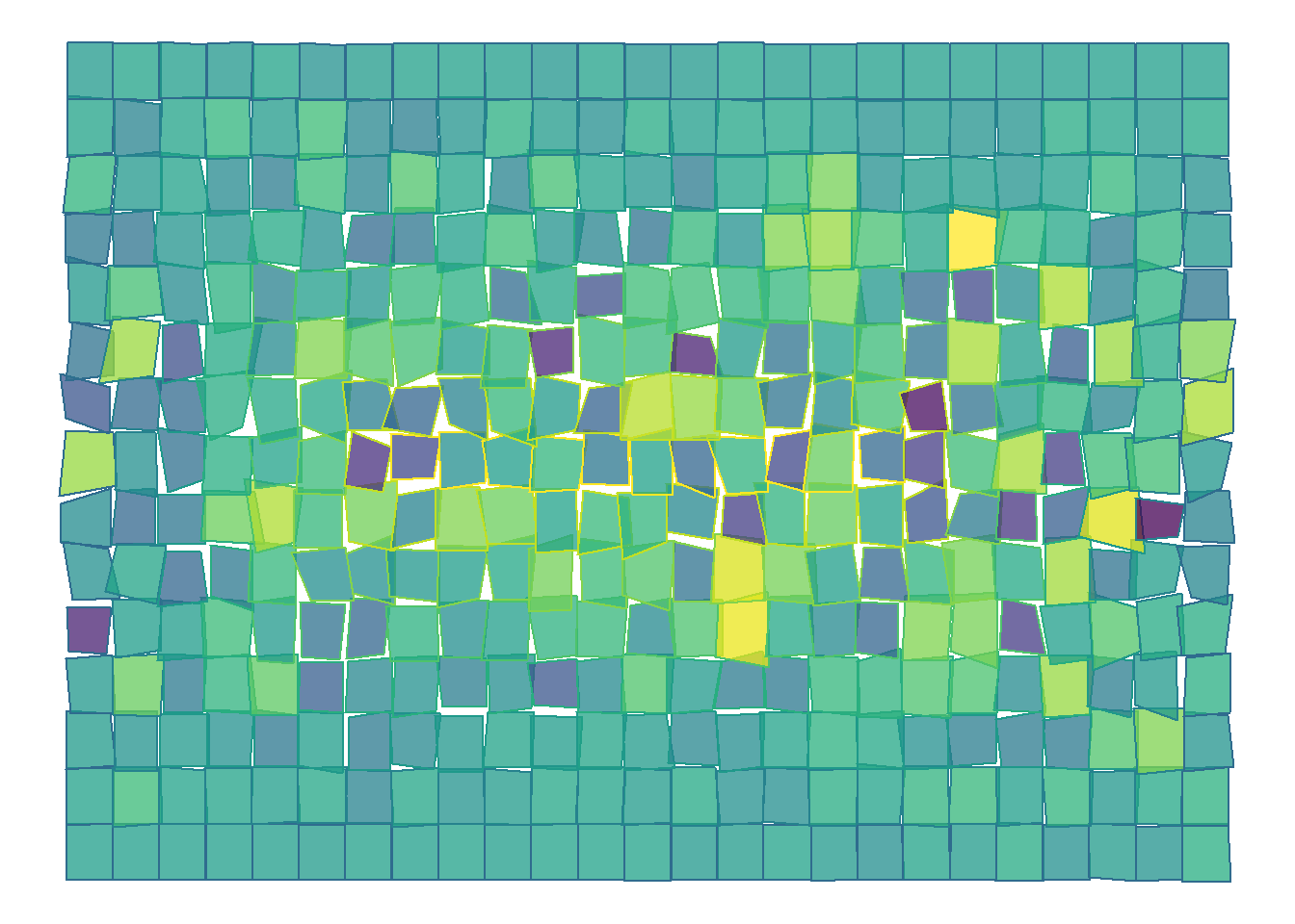 Fill colors are based on the average shift in segments of a rectangle so the more twisted away from the grid the more the fill color will change.